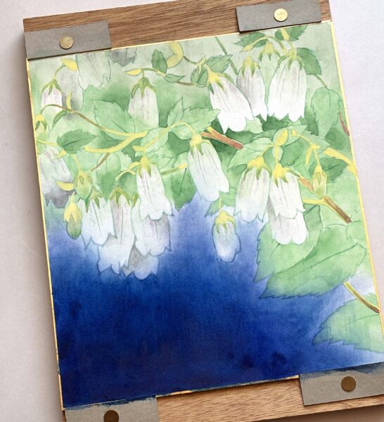 顔彩で描いた「蛍袋」の色紙が完成。